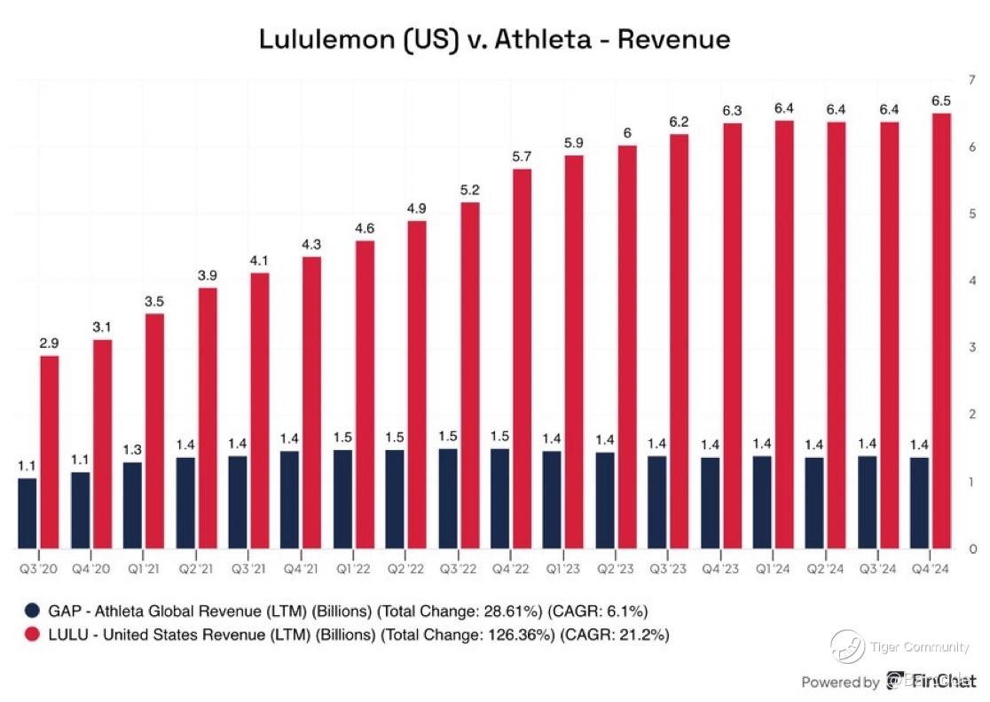 1. LULU versus Athleta (GAP). US revenue is up 126.36 percent since 2020 while GAP is flat