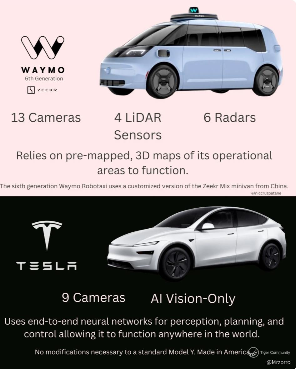 The newer generation of Waymo Robotaxi uses a customized version of the Zeekr Mix minivan from China. It is equipped with 13 cameras, 4 LIDAR sensors, and 6 radars. In contrast, Tesla takes a completely different approach and goes AI + vision only to drive. So it just has 9 cameras.