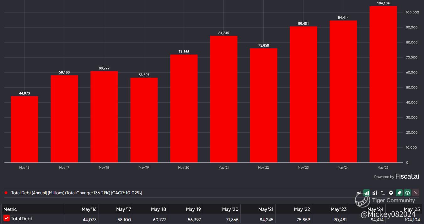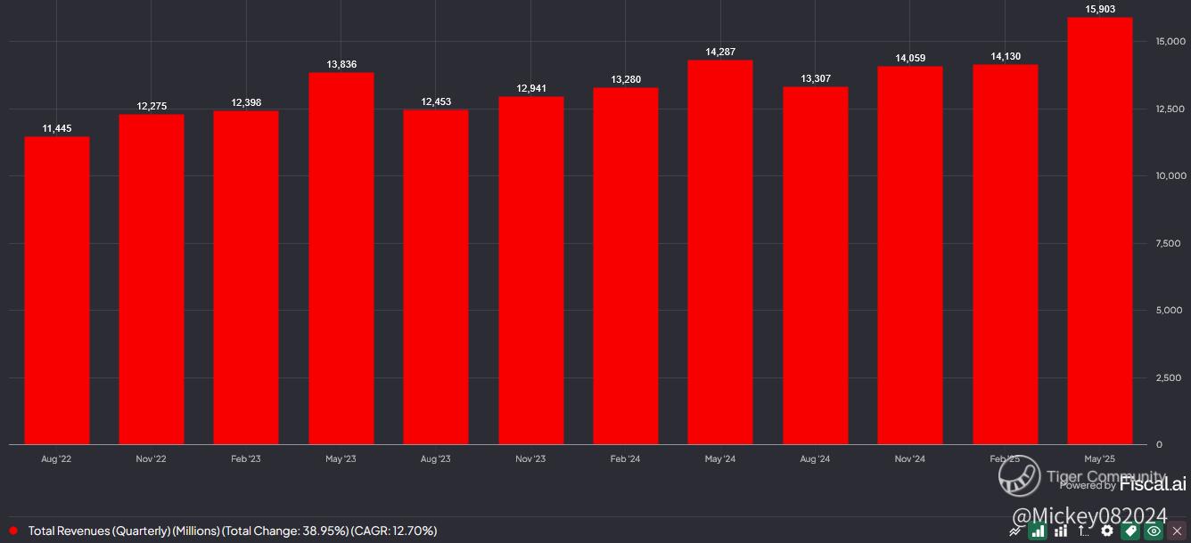 Digging deeper into the numbers, total revenue grew by 11.3%, with cost of revenue increasing 12.4%, and interest expenses rising 11%. That explains why net income grew at a slightly slower pace — up just 9% — despite double-digit top-line growth. Interest costs alone, which now approach $1 billion per quarter, are taking a sizable bite out of profitability.
