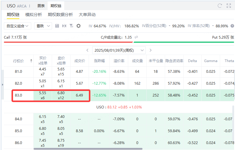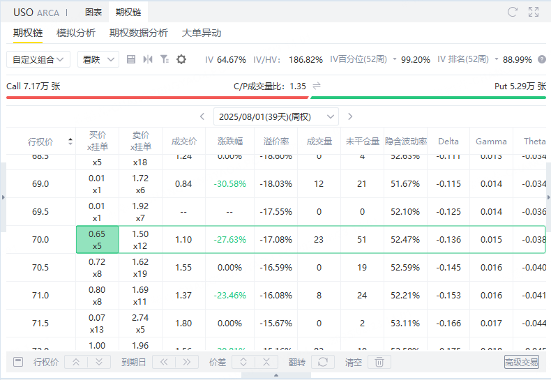 The current $United States Oil Fund LP(USO)$ price is $84.4, and we can get $110 by selling a put option with an expiration on August 1, 2025 and an exercise price of $70.