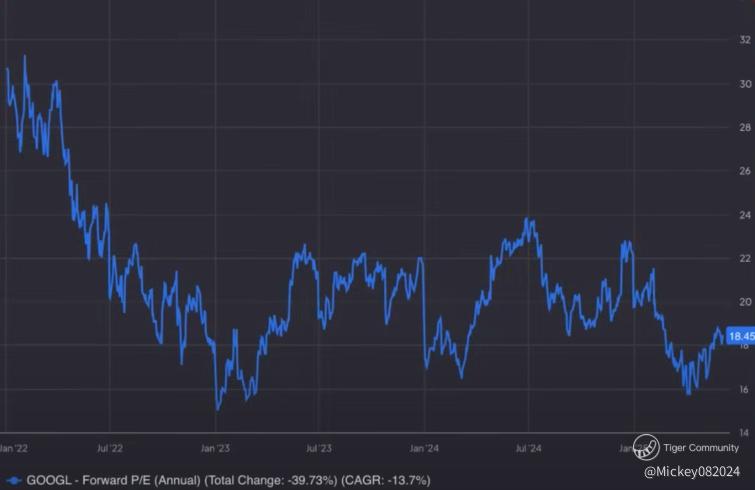 Earnings growth alone does not determine stock price — the valuation multiple applied by the market plays a critical role. Alphabet’s current forward P/E ratio is approximately 18.45, near the lowest it has been in recent years. Historically, Alphabet has traded at higher multiples during periods of greater investor confidence.
