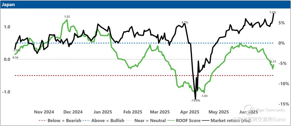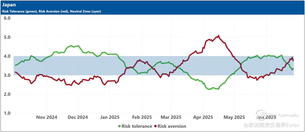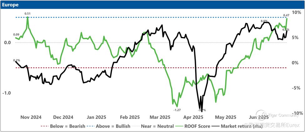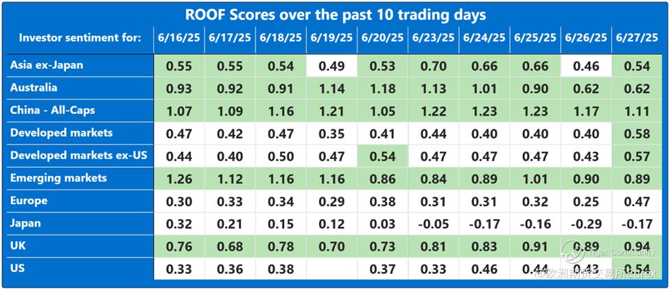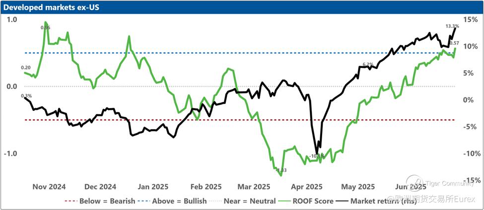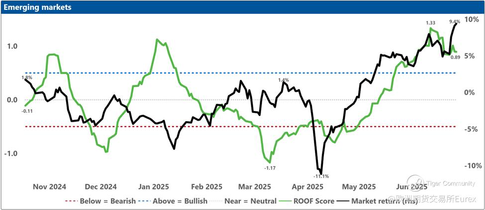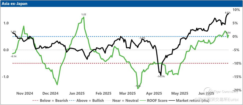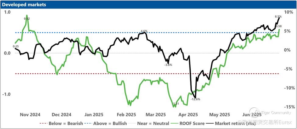 Investor sentiment continued its upward trend, closing the week on a bullish note in eight out of the ten markets we monitor. This marks an improvement from the previous week, with sentiment in two additional markets (Global Developed Markets and the US) turning bullish. European investors, while becoming increasingly positive, did not quite make the bullish list. The only exception was Japanese investors, who remained neutral despite a rising market. Demand for risk now strongly outweighs supply, which should temper any reaction to negative news surrounding the upcoming tariff deadline on July 9.