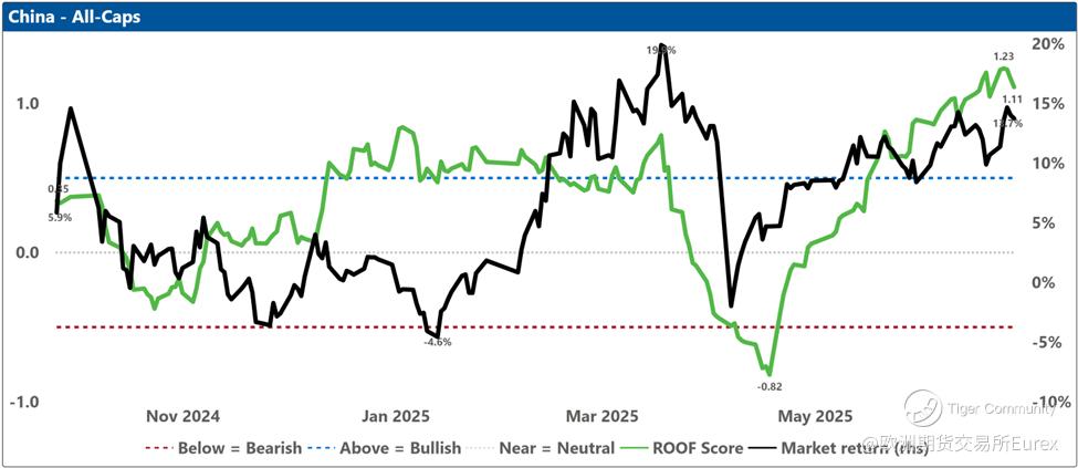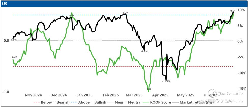 The top charts illustrate the ROOF ratio, which represents investor sentiment. This ratio is depicted in green on the left axis, while the cumulative returns of the underlying market are shown in black on the right axis. Key reference lines include: