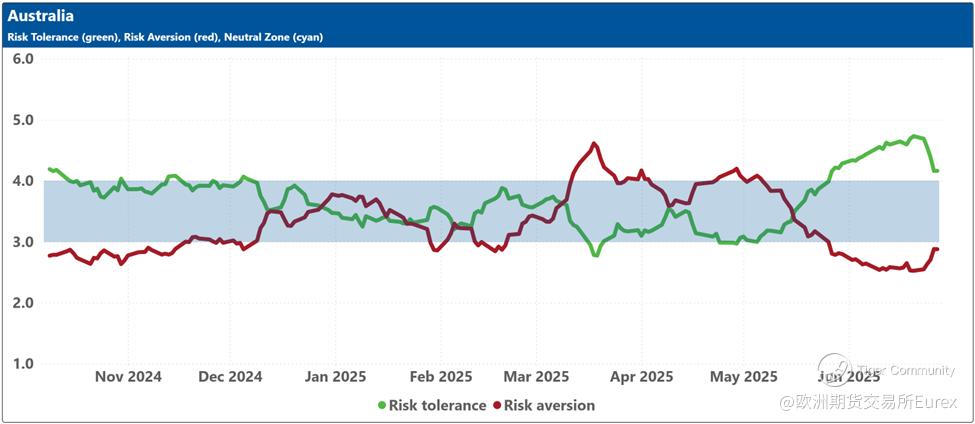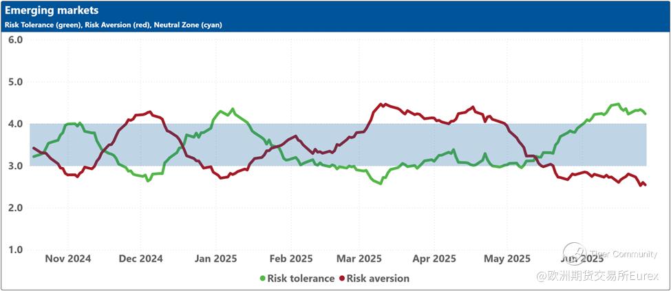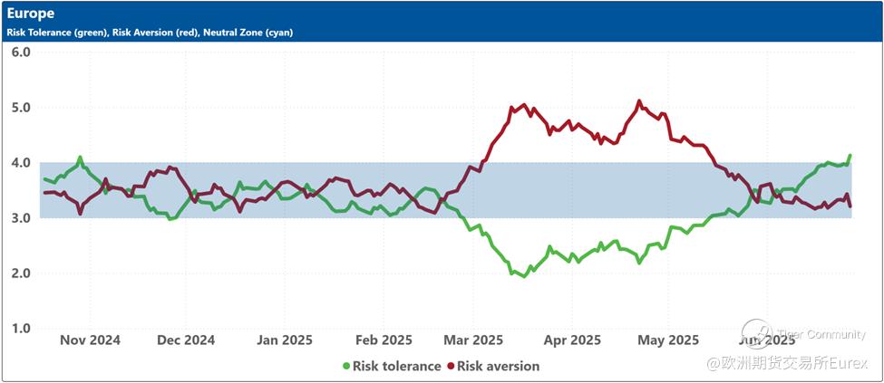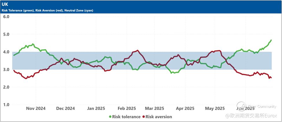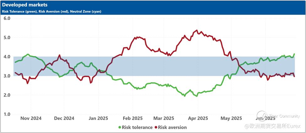 The blue shaded zone between levels 3 and 4 for both indicators signifies a reasonable balance between the supply and demand for risk in the market. When both lines remain within this blue zone, the market is considered ‘emotionally’ stable. However, when both lines move outside this zone, the significant imbalance in demand and supply for risk can lead to overreactions to unexpected news or risk events.