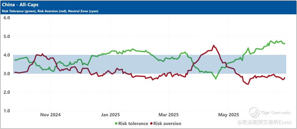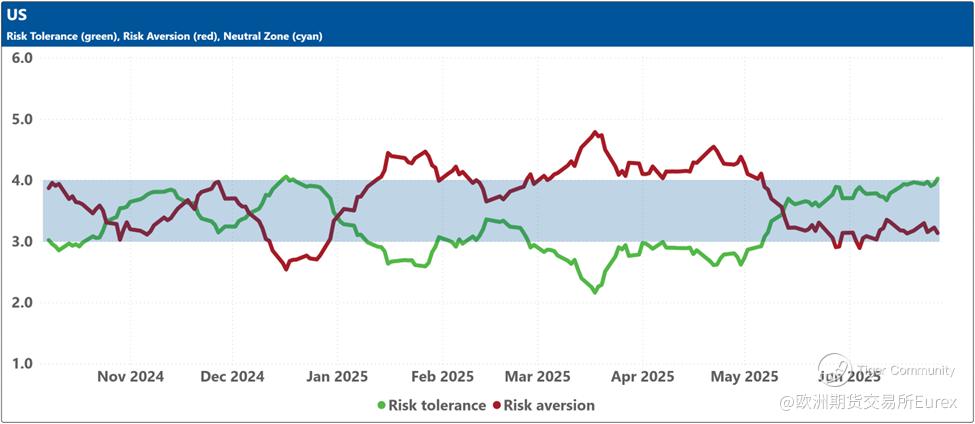 The bottom charts display the levels of risk tolerance (green line) and risk aversion (red line) within the market, representing investors' demand and supply for risk, respectively. Key insights include: