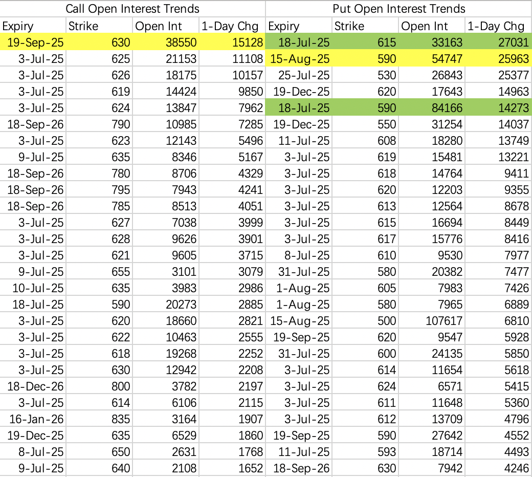 A bearish put spread expiring on July 18, using 615 puts and 590 puts, indicating a target range of 590–615.