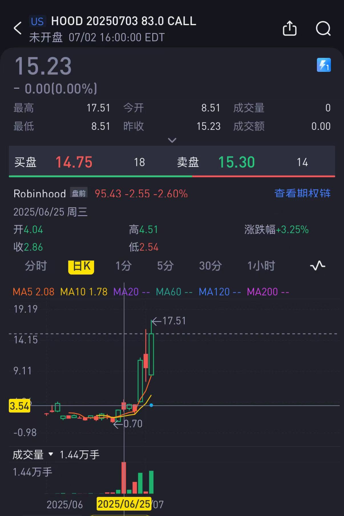 The 83 call ($HOOD 20250703 83.0 CALL$ ) was opened on June 25, three days before the rally.