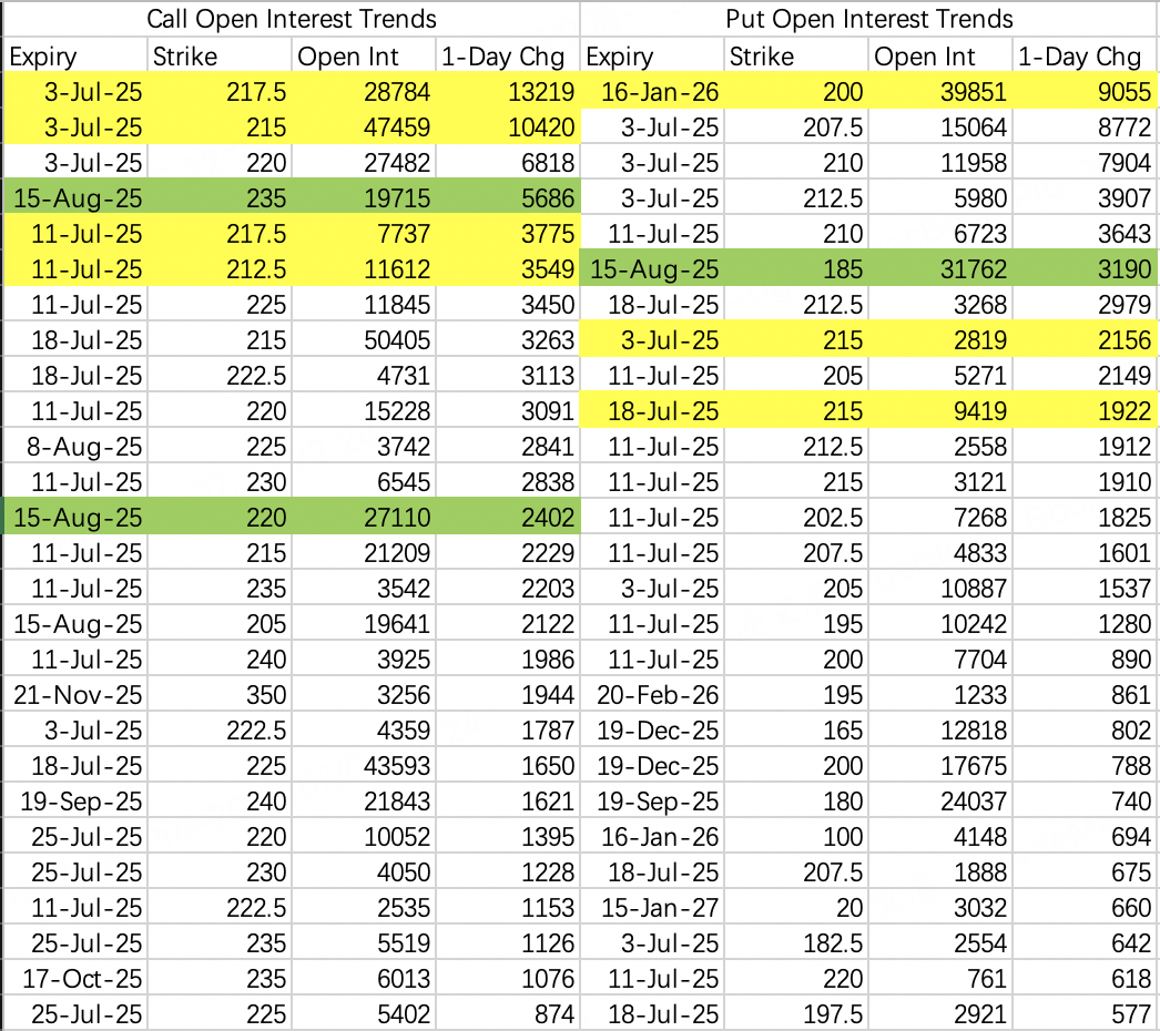 Unusually, bearish positions were opened with deep in-the-money strikes. This could suggest strong confidence in a price level around 215.