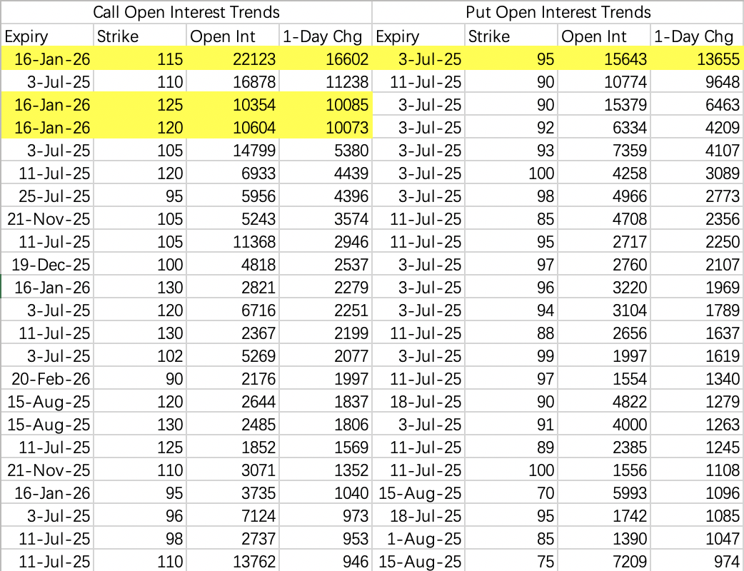 Upon further investigation, these bullish option positions were part of a roll trade. The 82 and 85 calls expiring this week ($HOOD 20250703 83.0 CALL$ and $HOOD 20250703 85.0 CALL$ ) were closed and rolled into the 2026 expiry 115, 120, and 125 calls ($HOOD 20260116 115.0 CALL$ , $HOOD 20260116 120.0 CALL$ , and $HOOD 20260116 125.0 CALL$ ).
