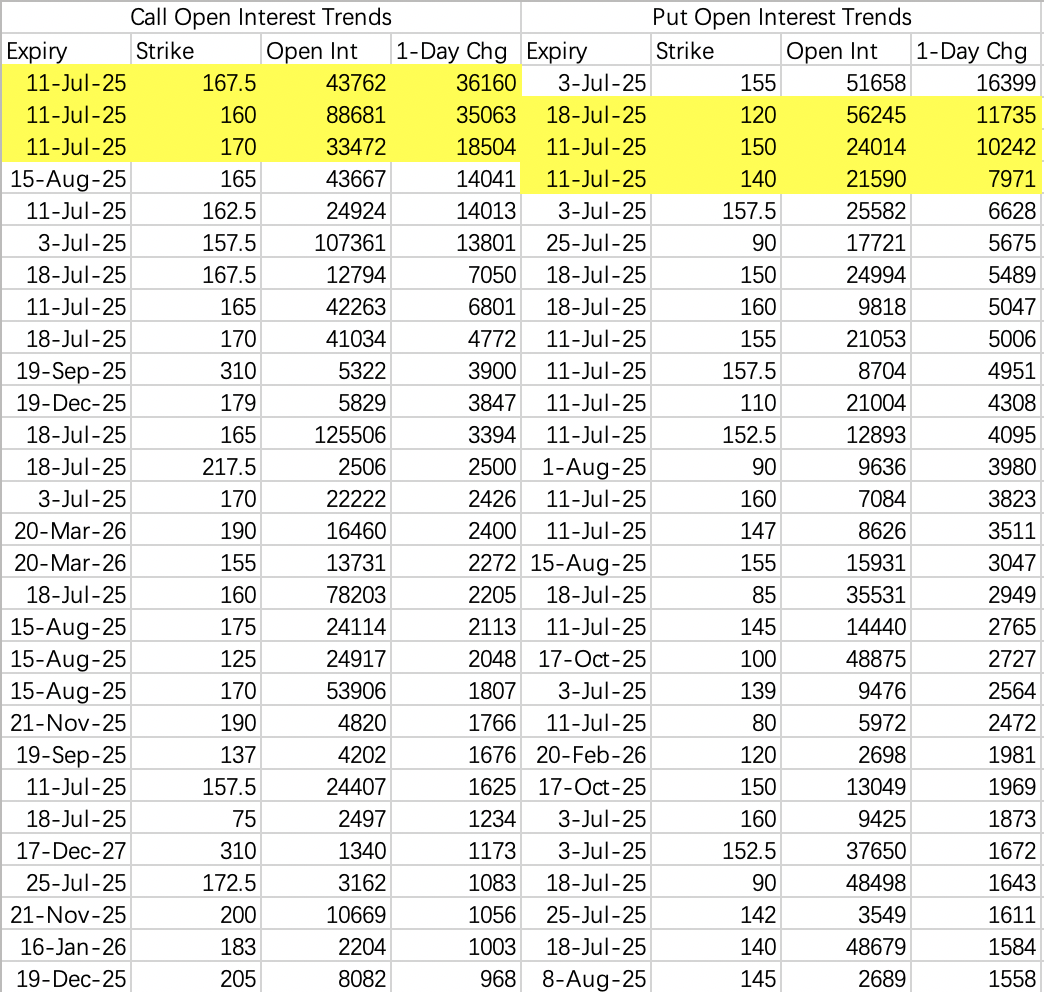 Bullish positions: Institutions are selling calls at 160 and 162.5, while hedging by buying 167.5 and 170 calls.