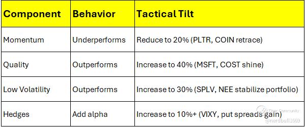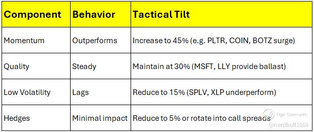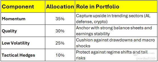 In the following section, I am putting up a simulated July factor rotation model, it is blending momentum, quality, and low volatility with tactical hedges to manage risk and capture asymmetric upside.