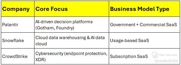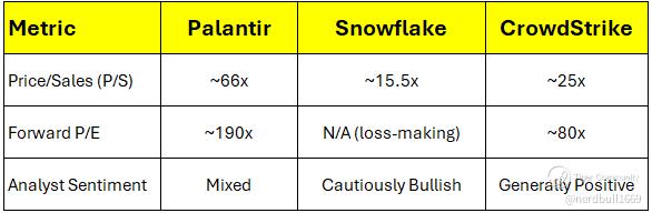 Palantir’s valuation is by far the richest, pricing in massive AI upside. Snowflake’s recent security breach has dented sentiment, while CrowdStrike is seen as a steady compounder in a critical sector.