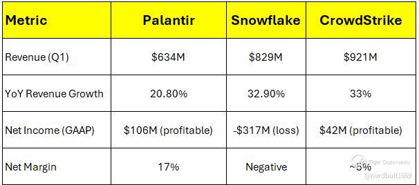 Palantir stands out for consistent GAAP profitability, while Snowflake is still burning cash despite strong growth. CrowdStrike is threading the needle with both growth and profitability.