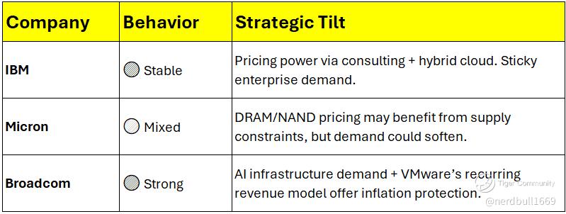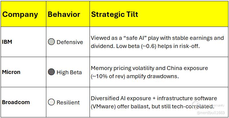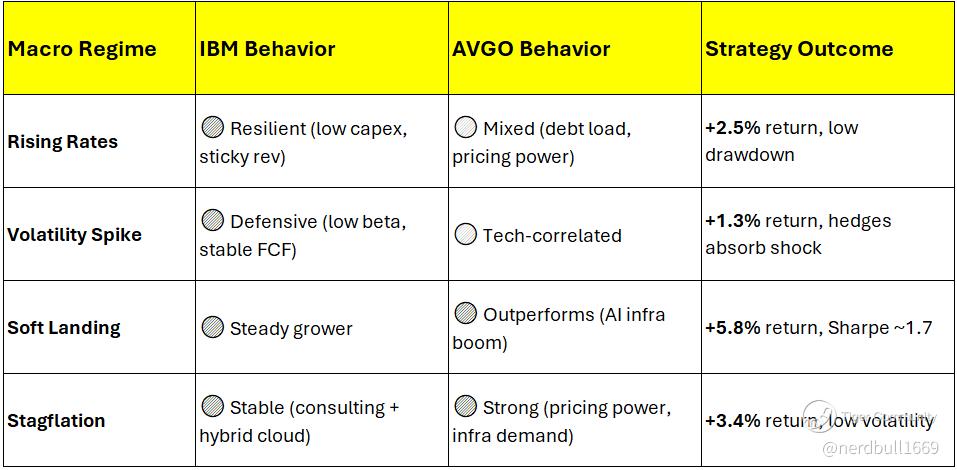 IBM flexes up in risk-off and rate-sensitive regimes. Broadcom dominates in soft landings. Oracle adds enterprise software ballast with optionality from AI and cloud.