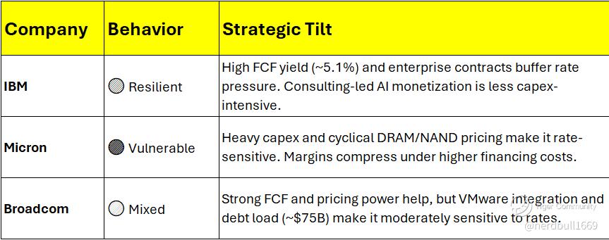 In this section I would be modelling how IBM, Micron (MU), and Broadcom (AVGO) might behave under three macro regimes: rising interest rates, volatility spikes, and stagflation. Each has a distinct risk/reward profile based on cash flow, capex intensity, and AI exposure.