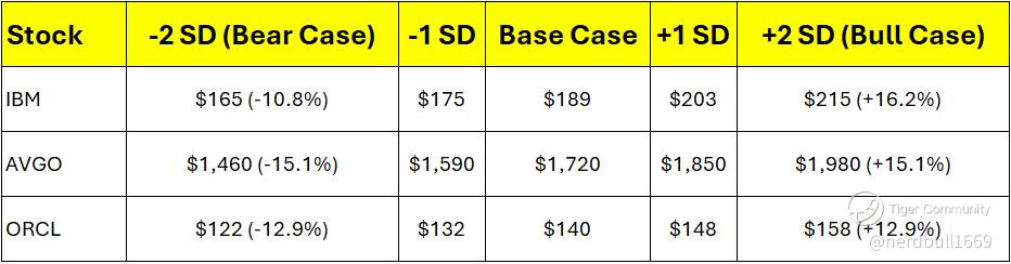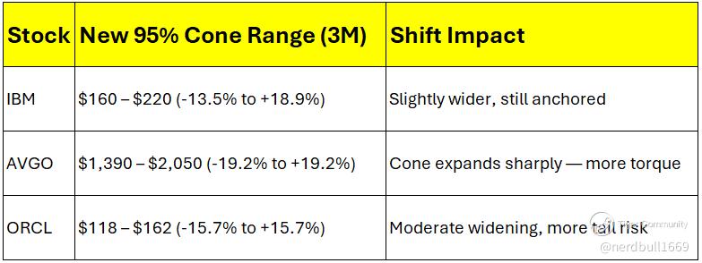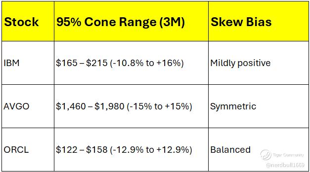 The cone widens most for Broadcom, reflecting its higher beta and earnings optionality. IBM remains the ballast, while Oracle’s cone expands modestly.