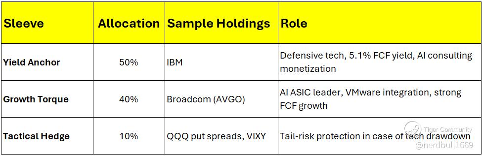 This barbell thrives on adaptive rebalancing — letting Broadcom run in melt-ups while IBM anchors in risk-off regimes.