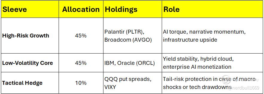 Macro Tilt: If VIX > 25 or 10Y > 5.25%, reduce PLTR/AVGO to 30%, increase IBM/ORCL to 60%.