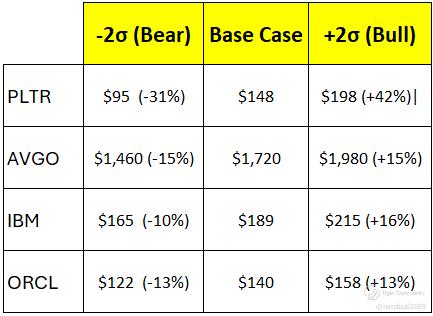 Interpretation: Palantir introduces the widest cone — high upside, high risk. IBM and Oracle compress the downside tail. Broadcom offers torque with moderate volatility.