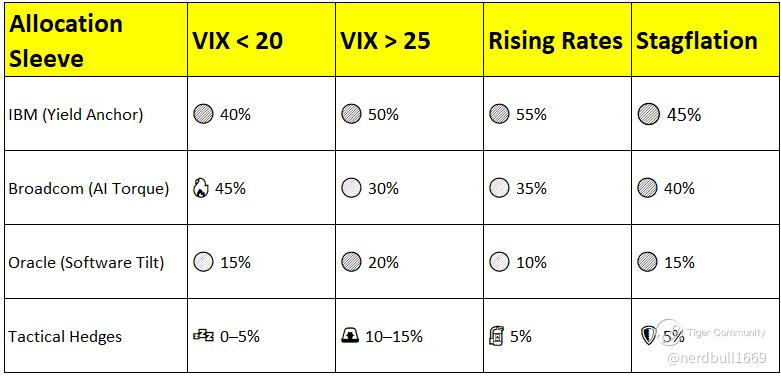 Macro Tilt: In a VIX > 25 or stagflation regime, reduce PLTR/AVGO to 30%, increase IBM/ORCL to 60%.
