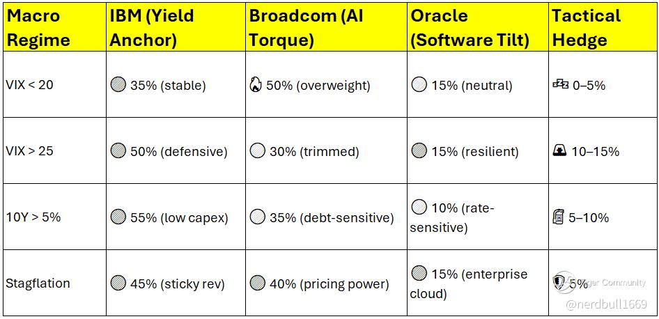 This matrix helps us tilt allocations based on macro signals, letting IBM absorb shocks, Broadcom ride AI momentum, and Oracle flex with enterprise IT cycles.