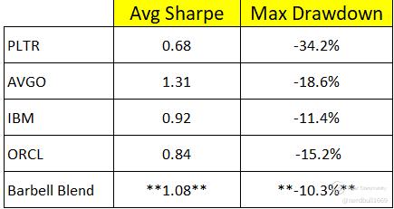 Next, we will try to the barbell remix simulation which will integrates Palantir into the high-torque sleeve alongside Broadcom, while IBM and Oracle form the low-volatility, cash-flow-rich ballast.