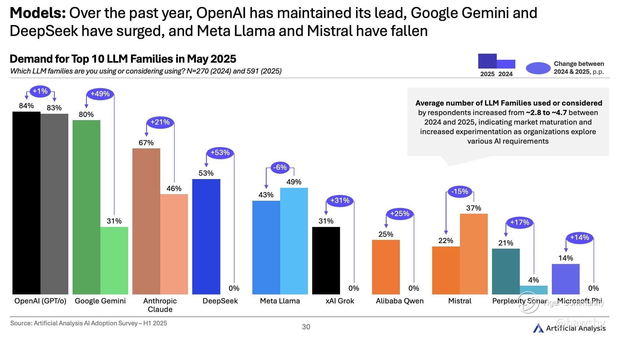 OpenAI's GPT continues to hold the top spot in terms of overall demand. They are maintaining their lead, but the rapid acceleration of rivals like Gemini could put increasing pressure on OpenAI to innovate and expand its offerings to defend its top position in the coming years.