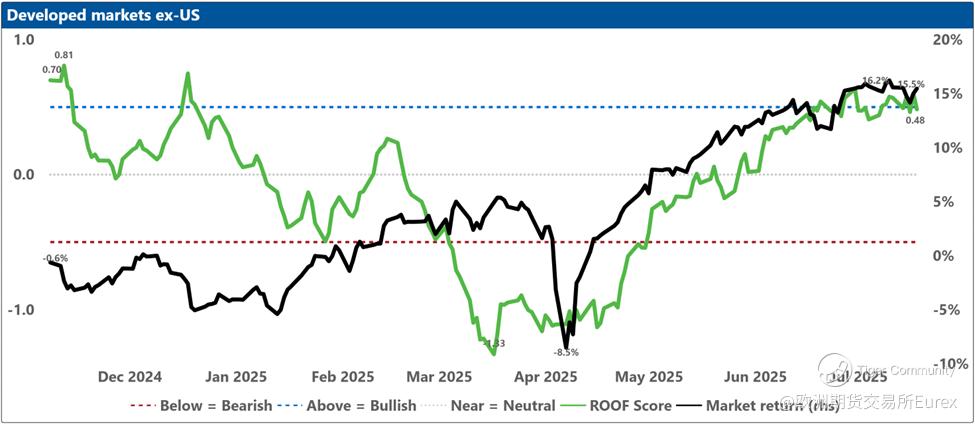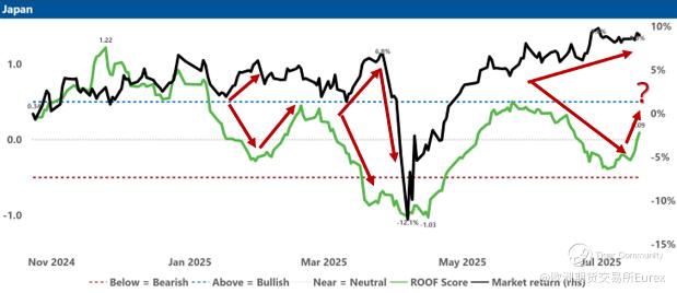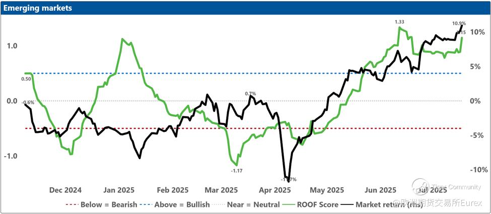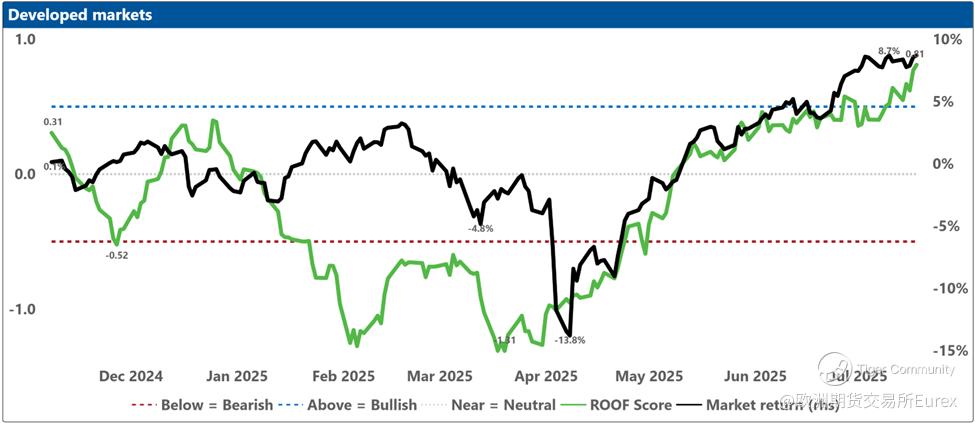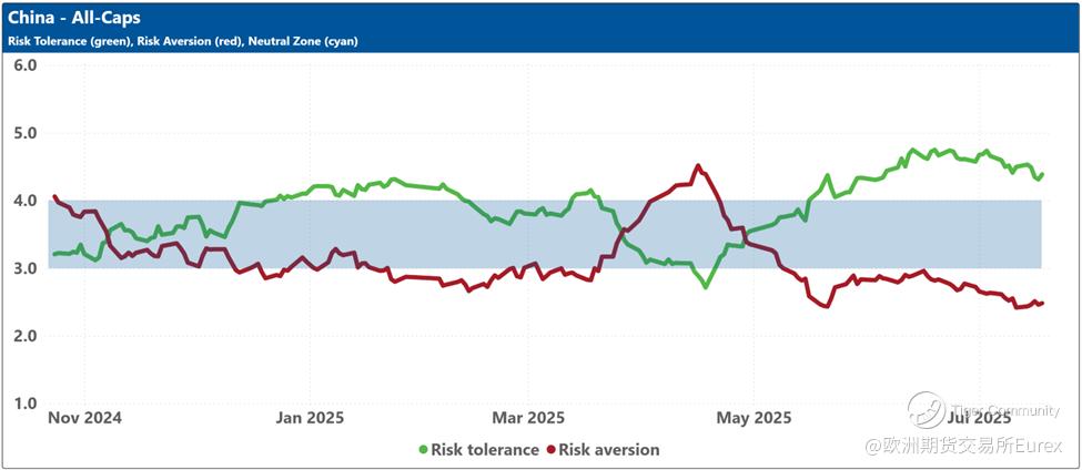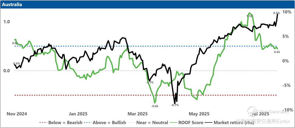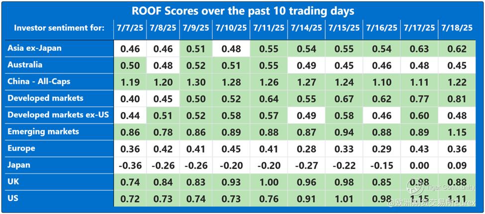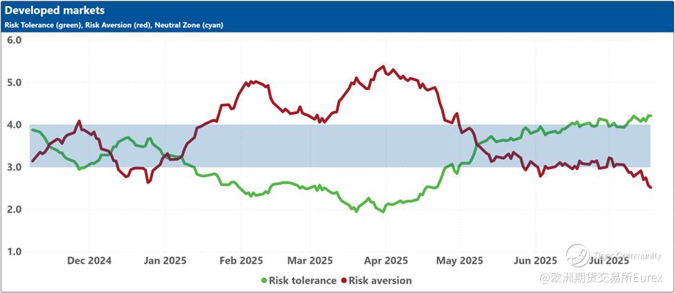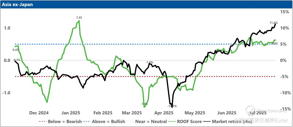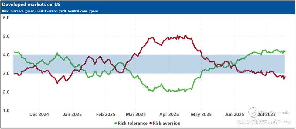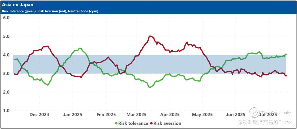 Investor sentiment remains resiliently bullish despite looming tariff deadlines, with a notable positive sentiment risk premium observed in six of the ten markets we track—namely Asia ex-Japan, China, Global Developed Markets, Global Emerging Markets, the UK, and the US. Sentiment also held positive in Australia, Europe, and Global Developed ex-US markets. In contrast, sentiment in Japan was mixed, influenced by the lack of a trade agreement with the US and anticipation surrounding a key Upper House election this weekend, which could result in a populist shift disrupting the political status quo. Overall, except in Japan, investor sentiment continues to support the current market rallies across global markets.