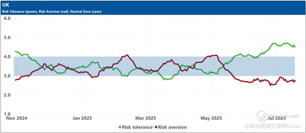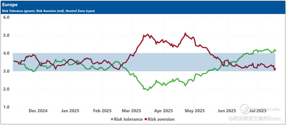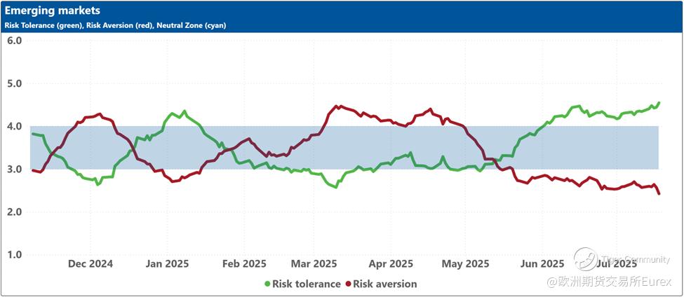 The blue shaded zone between levels 3 and 4 for both indicators signifies a reasonable balance between the supply and demand for risk in the market. When both lines remain within this blue zone, the market is considered ‘emotionally’ stable. However, when both lines move outside this zone, the significant imbalance in demand and supply for risk can lead to overreactions to unexpected news or risk events.