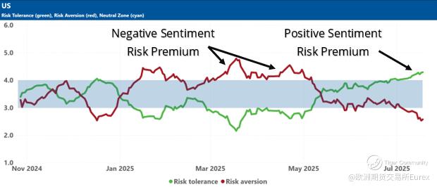 When risk tolerance (green line) exceeds risk aversion (red line), more investors are willing to buy risk assets than there are investors willing to sell them at the current price. This scenario forces risk-tolerant investors to offer a premium to entice more risk-averse investors to trade, thereby driving markets upward.