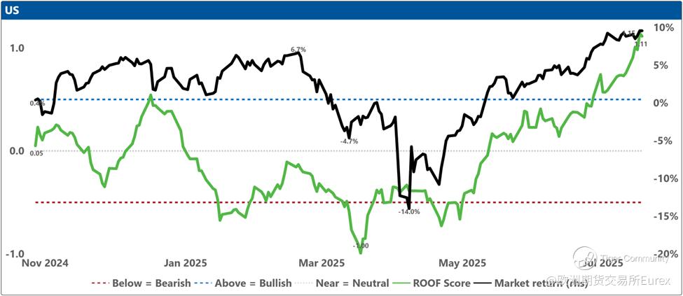 The top charts illustrate the ROOF ratio, which represents investor sentiment. This ratio is depicted in green on the left axis, while the cumulative returns of the underlying market are shown in black on the right axis. Key reference lines include: