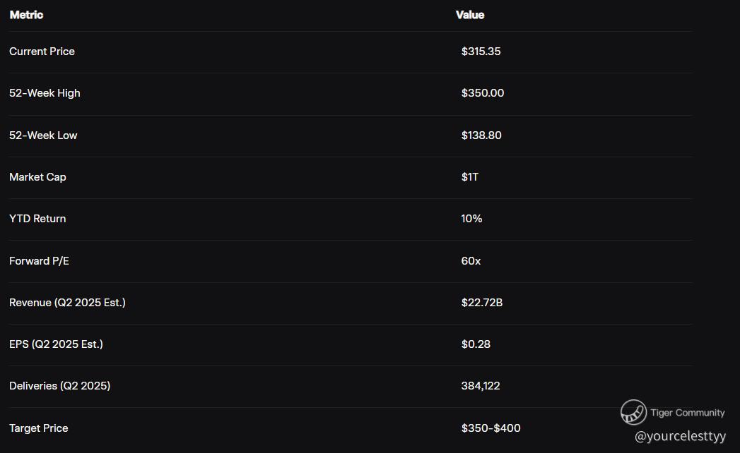 Tesla ( $Tesla Motors(TSLA)$ ) is set to unveil its Q2 2025 earnings on July 23, 2025, with the market bracing for a challenging quarter after a 14% year-over-year delivery drop to 384,122 vehicles. Analysts expect an adjusted EPS of $0.28, down 29% from $0.42 in Q2 2024, and revenue of $22.72 billion, down 11% from $24.93 billion. Yet, low expectations could set the stage for a positive surprise, especially if CEO Elon Musk delivers bullish commentary on robotaxi deployment, new models like the Model Y L, humanoid robots, or AI advancements. With Tesla’s stock at $315.35, up 10% year-to-date (YTD), investors are buzzing: Can Tesla beat the low bar and spark a rally, or will it consolidate further? This report dives into Tesla’s earnings outlook, potential surprises, and strategic investment approaches to seize this opportunity while managing risks.