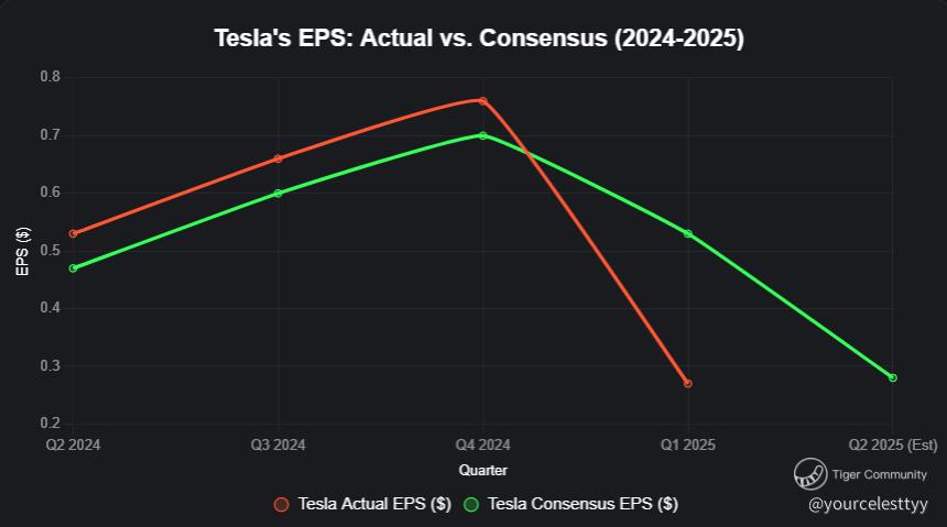 The market has priced in Tesla’s challenges—declining deliveries, revenue, and margins—setting a low bar for Q2. Tesla’s Q2 delivery beat (384,122 vs. 387,000 expected) and cost-cutting efforts suggest potential for an EPS or revenue surprise. Historically, Tesla has capitalized on low expectations, as seen in Q1 2025 when a revenue beat sparked a 5% stock pop despite an EPS miss. With a consensus EPS of $0.28, even a modest beat (e.g., $0.30-$0.32) could trigger a rally, especially if Musk’s commentary is optimistic.