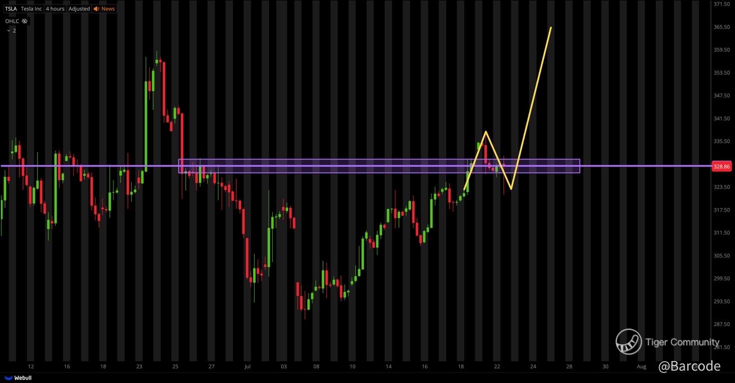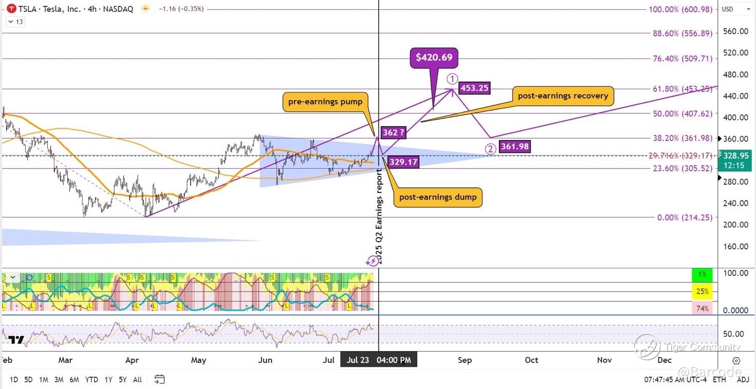 • TSLA below $329 into earnings: A beat with bullish guidance could drive a clean break through $337.50, targeting $360 then $420