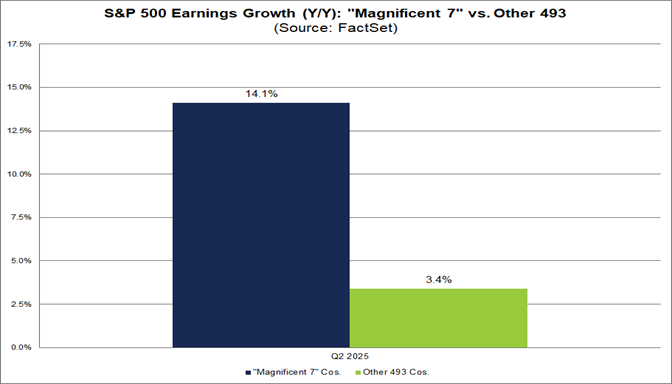 In aggregate, Mag 7 companies are expected to report year-over-year earnings growth of 14.1% for the second quarter. Excluding these seven companies, the blended (combines actual and estimated results) earnings growth rate for the remaining 493 companies in the S&P 500 would be 3.4% for Q2 2025.