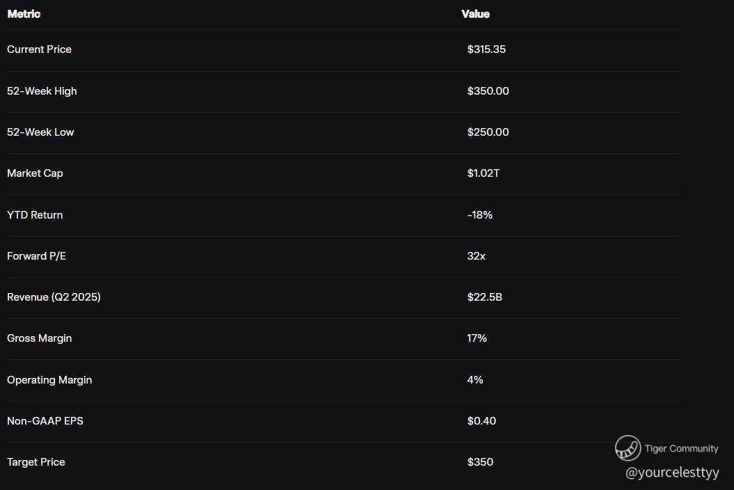 Tesla’s stock, at $315.35, is down 18% YTD and 4% post-earnings, reflecting bearish sentiment: