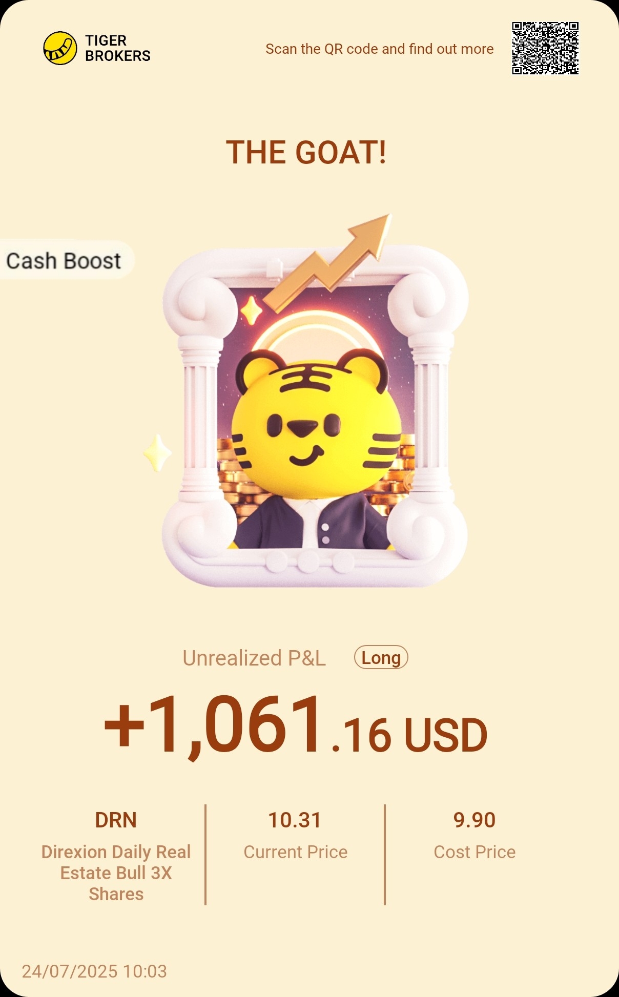 “$Direxion Daily Real Estate Bull 3X Shares(DRN)$ lucked out on REIT rebound! Fed rate cut hopes + commercial real estate recovery boosted 3x gains. Took 50% profit given ETF volatility, keeping some for policy clarity.”