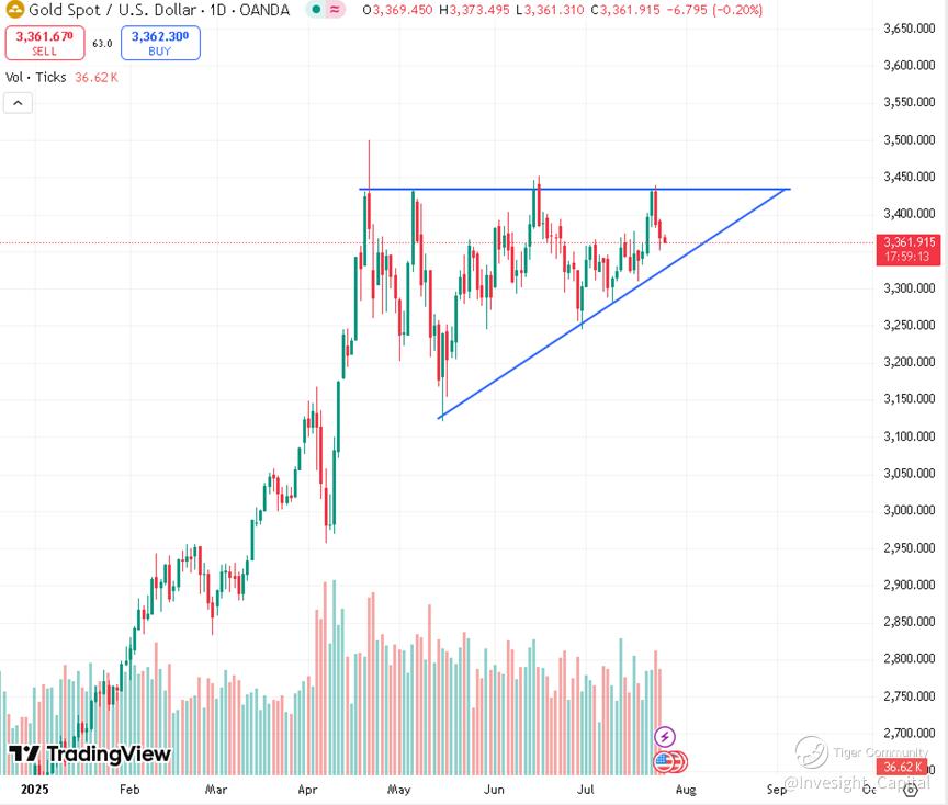 Gold prices returned above $3,400 this week but faced strong resistance around $3,440. On Wednesday, prices dropped $50 in a single day due to profit-taking. A retest of the upward trendline support is likely, which—if confirmed—could generate new momentum for another test above $3,400. In the bigger picture, gold remains in a bullish trend. However, a breakout to new highs beyond $3,440 still requires a catalyst. Considering ongoing tariff concerns, J.P. Morgan $JPMorgan Chase(JPM)$ recently raised its Q4 gold target to $3,675, up from $2,950.