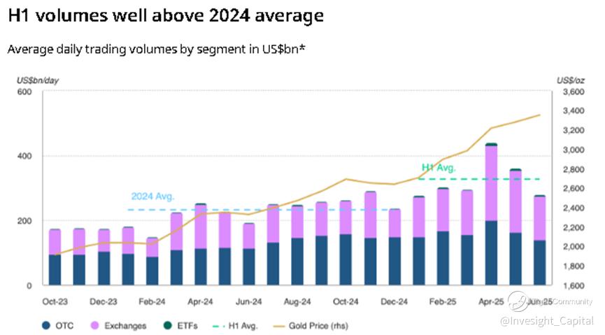 In H1 2025, gold’s average daily trading volume hit $329 billion, a record high for the period. However, trading volume declined by 20% in June, likely due to short-term equity market rebounds and weakened upward momentum in gold.