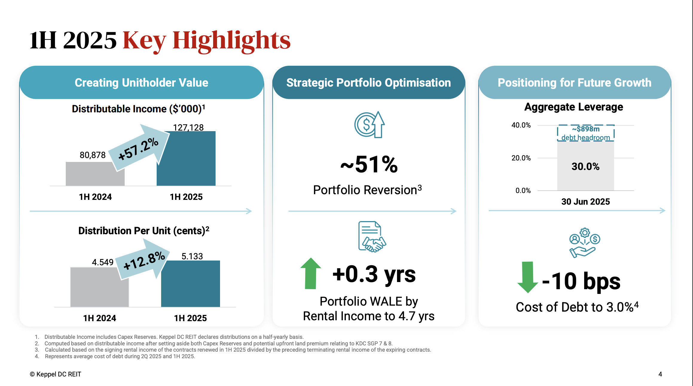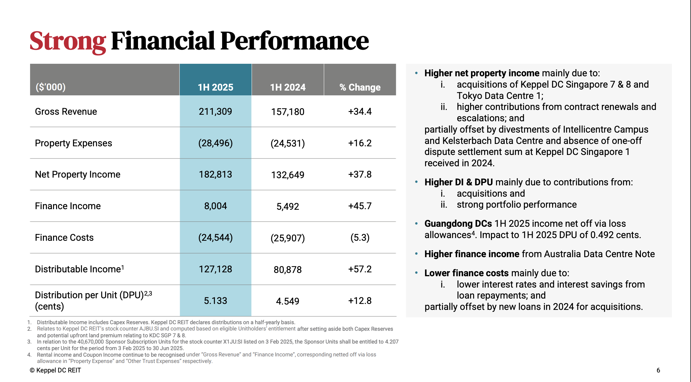 Keppel DC REIT recent announced it's distributable income of $127.1 million for 1H2025, representing a 57.2% increase y-o-y.