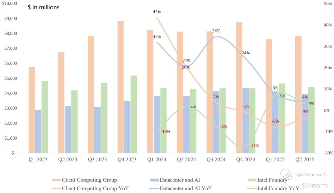 ~Client Computing Group (CCG): The PC-centric group remains Intel's largest business, with revenue of $7.87 billion (-3% YoY, +3% QoQ), accounting for 61% of total revenue. However, its operating profit fell 22% YoY to $2.05 billion, with operating margin at 26.1%—a new low since Q2 2023.