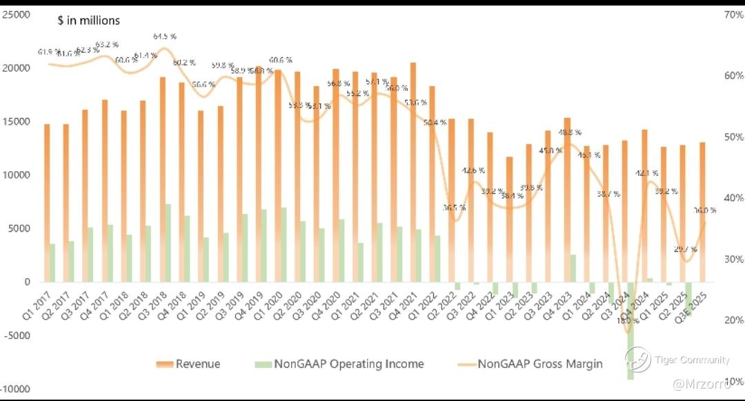~Gross Margin: GAAP gross margin hit a new low at 27.5%, down 7.9 pts YoY and 9.4 pts QoQ. Non-GAAP gross margin was 29.7%, down 9.0 pts YoY and 9.5 pts QoQ, significantly missing the 36.5% guidance. The miss was primarily impacted by incremental costs from spending reduction plans, including ~$800 million in non-cash impairments and accelerated depreciation, and ~$200 million in one-time period costs. Excluding these impacts, the non-GAAP gross margin would have been 37.5%, beating guidance.