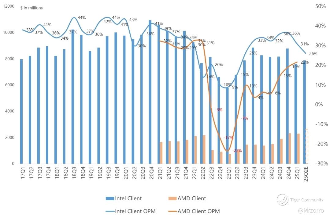 Intel's business remains propped up by its traditional PC business, which contributes 50-60% of revenue. However, due to $Advanced Micro Devices (AMD.US)$ 's sustained competitive lead in both desktop and notebook, a clear seesaw effect has emerged: as AMD's PC revenue grows, its profit margins are closing the gap with Intel's.