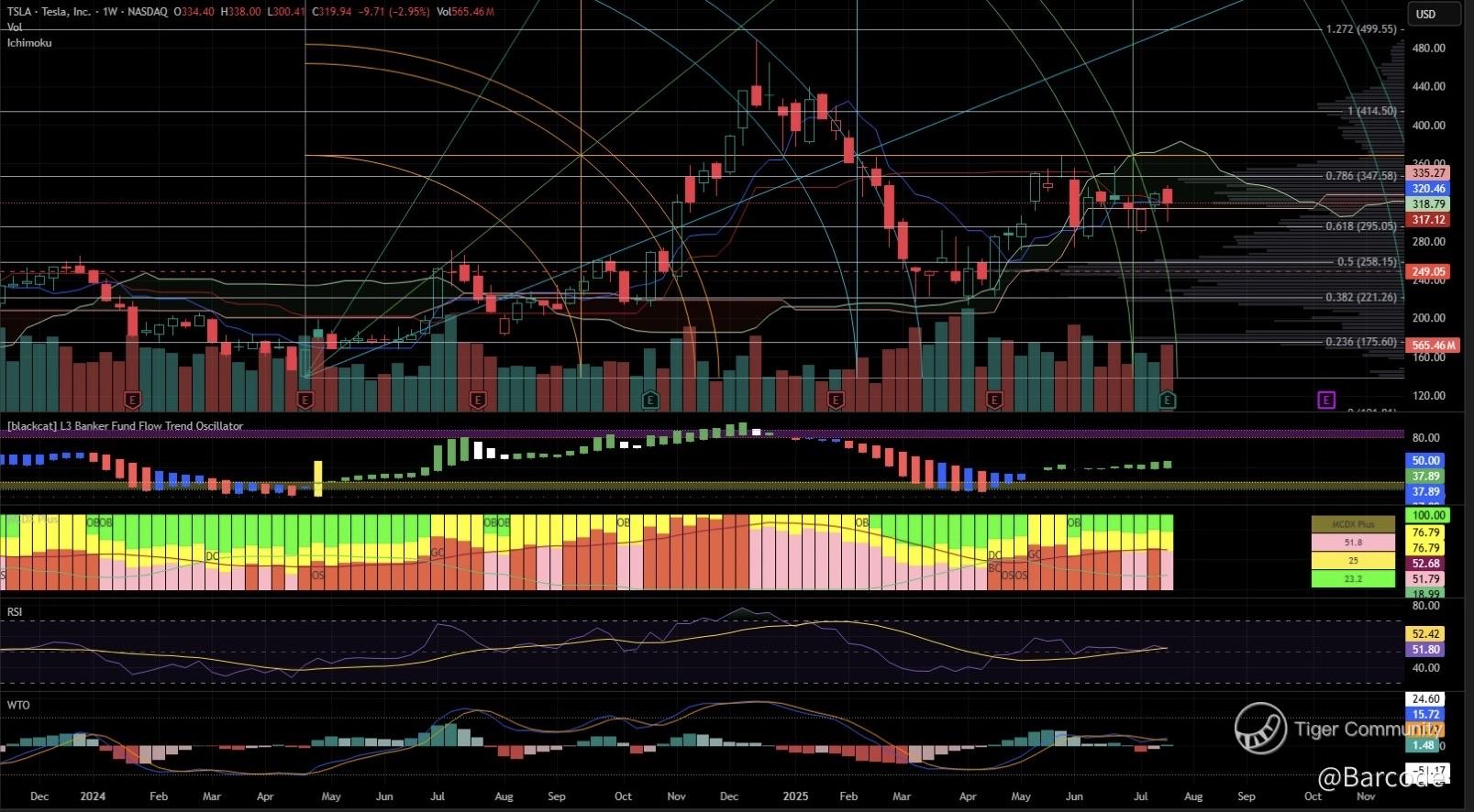 On the weekly, Tesla is consolidating just above the cloud base, holding $295.05 at the 0.618 retracement level. The MACD histogram is neutralising and RSI sits at 51.9 with a modest upward slope.