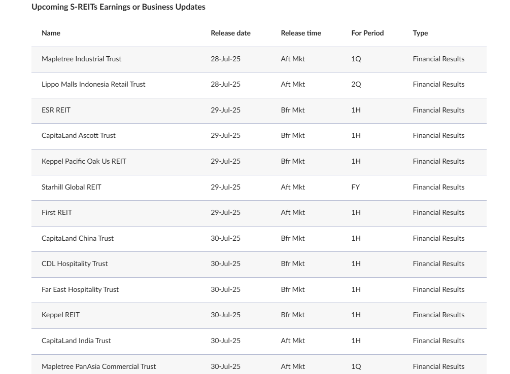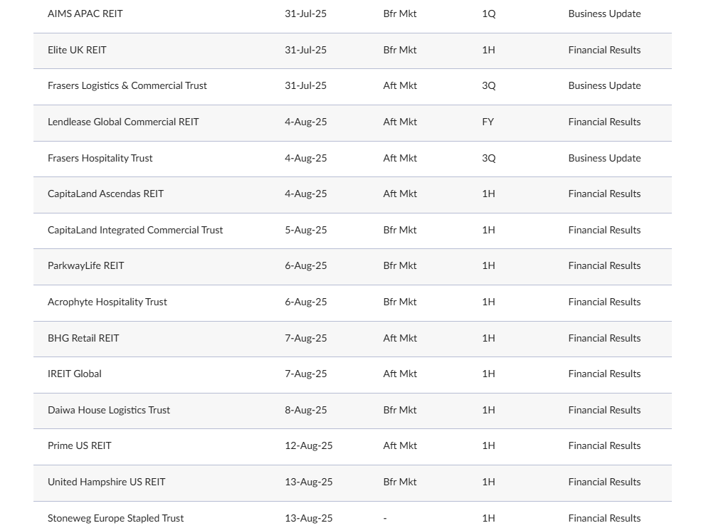 Another 30 S-REITs have also announced that their latest earnings will be scheduled for release between July 28 and Aug 14. Among the 37 S-REITs, 31 are reporting quarterly or half-year financial results, four will provide quarterly business updates, and two will provide full-year financial results.