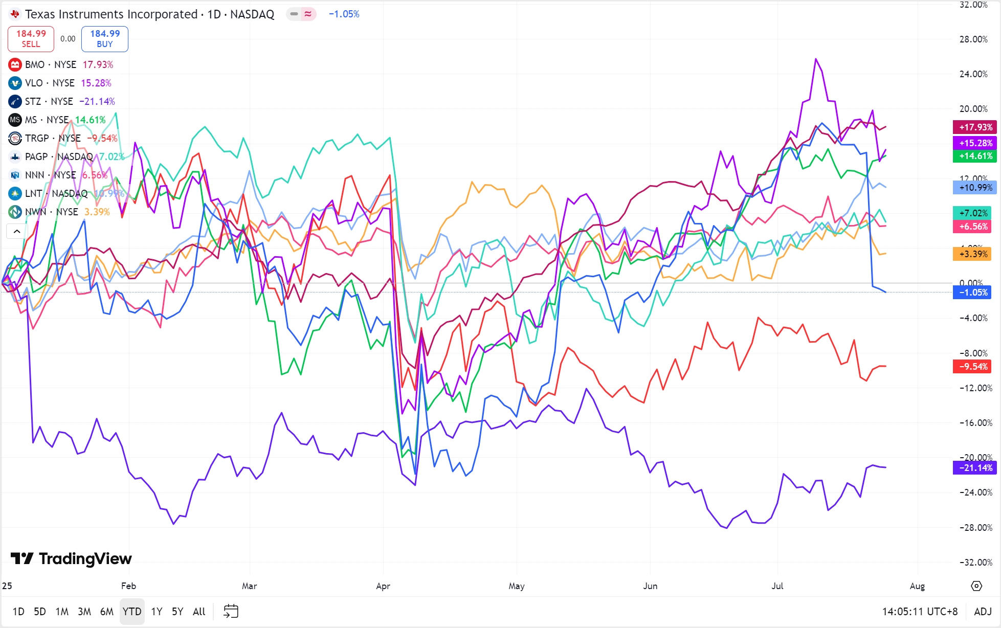 TradingView data from 2025 shows that the stock prices of companies such as $Bank of Montreal(BMO)$ , $Valero(VLO)$ , $Morgan Stanley(MS)$ , $Plains Group Holdings LP(PAGP)$ , $NNN REIT INC(NNN)$ , and $Northwest Natural Gas(NWN)$ rose, while those of $Texas Instruments(TXN)$ , $Constellation(STZ)$ , $Targa Resources(TRGP)$ ), and Alliant Energy Corporation (LNT) declined.