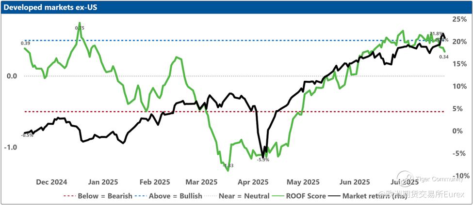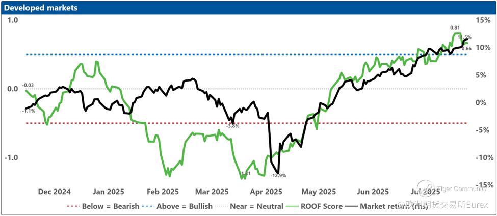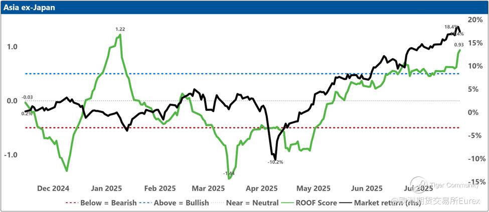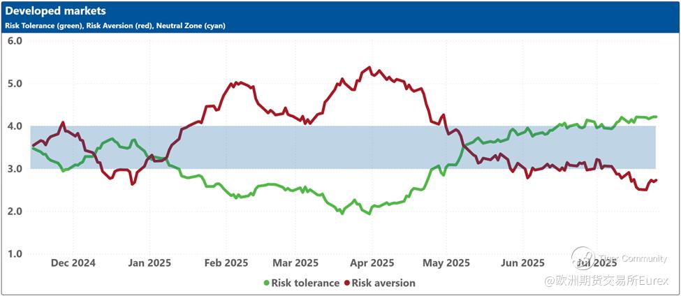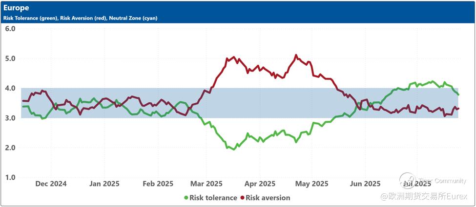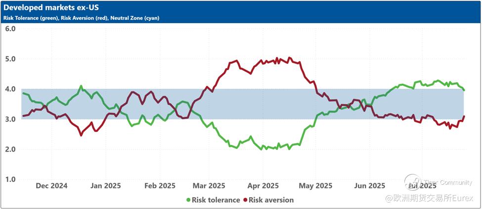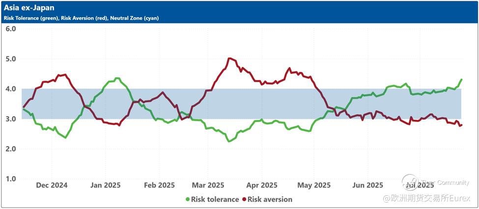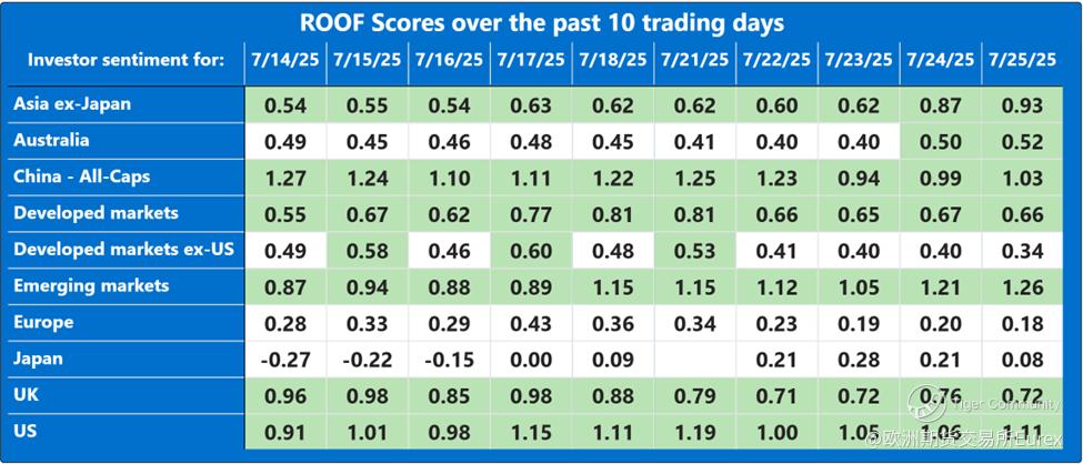 Investor sentiment remained strong last week, buoyed by news of the US-Japan trade deal. Seven of ten markets ended bullish, though sentiment in Japan stayed neutral due to political uncertainty after the LDP's election loss put Ishida’s leadership in question. European sentiment also remained neutral ahead of the US deal deadline, but Sunday's framework agreement may encourage more risk-taking among those investors this week. As of Friday’s close, there is a strong positive sentiment risk premium in five markets: Asia ex-Japan, China, Global Developed markets, Global Emerging markets, and the US. The other five markets all showed a more balanced supply-and-demand for risk (i.e. more demand than supply but not enough to trigger a positive sentiment risk premium).