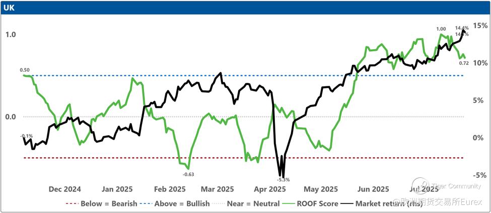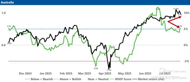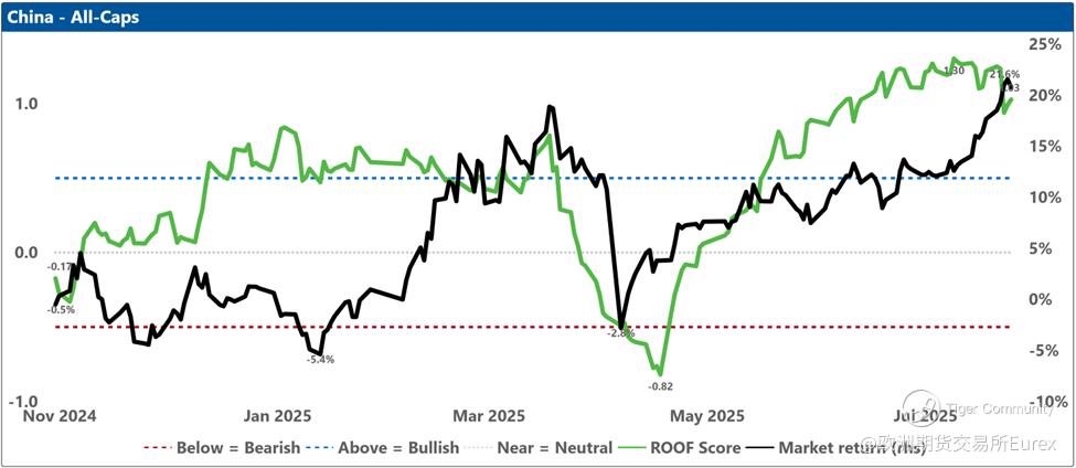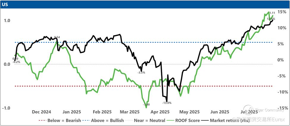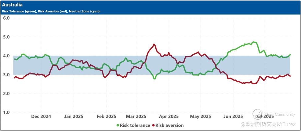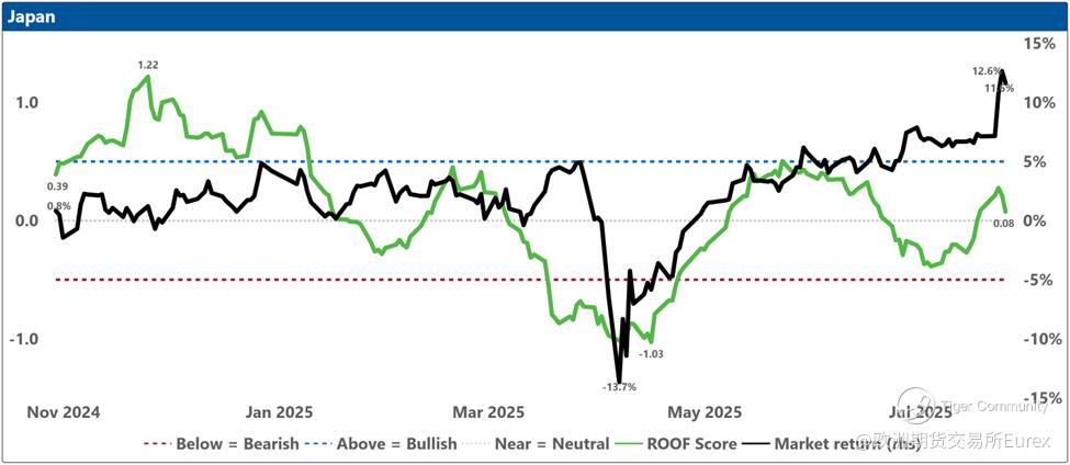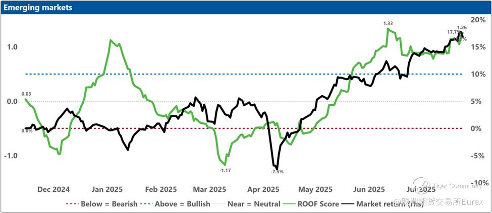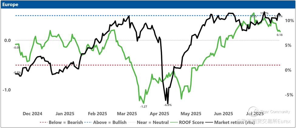 Investor sentiment remained strong last week, buoyed by news of the US-Japan trade deal. Seven of ten markets ended bullish, though sentiment in Japan stayed neutral due to political uncertainty after the LDP's election loss put Ishida’s leadership in question. European sentiment also remained neutral ahead of the US deal deadline, but Sunday's framework agreement may encourage more risk-taking among those investors this week. As of Friday’s close, there is a strong positive sentiment risk premium in five markets: Asia ex-Japan, China, Global Developed markets, Global Emerging markets, and the US. The other five markets all showed a more balanced supply-and-demand for risk (i.e. more demand than supply but not enough to trigger a positive sentiment risk premium).