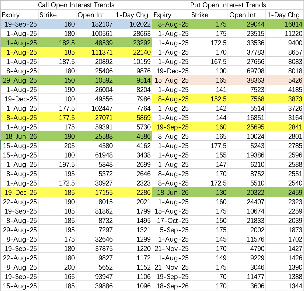 Last week, institutions sold $AMD 20250801 170.0 CALL and $AMD 20250801 172.5 CALL, while hedging with $AMD 20250801 177.5 CALL and $AMD 20250801 180.0 CALL.