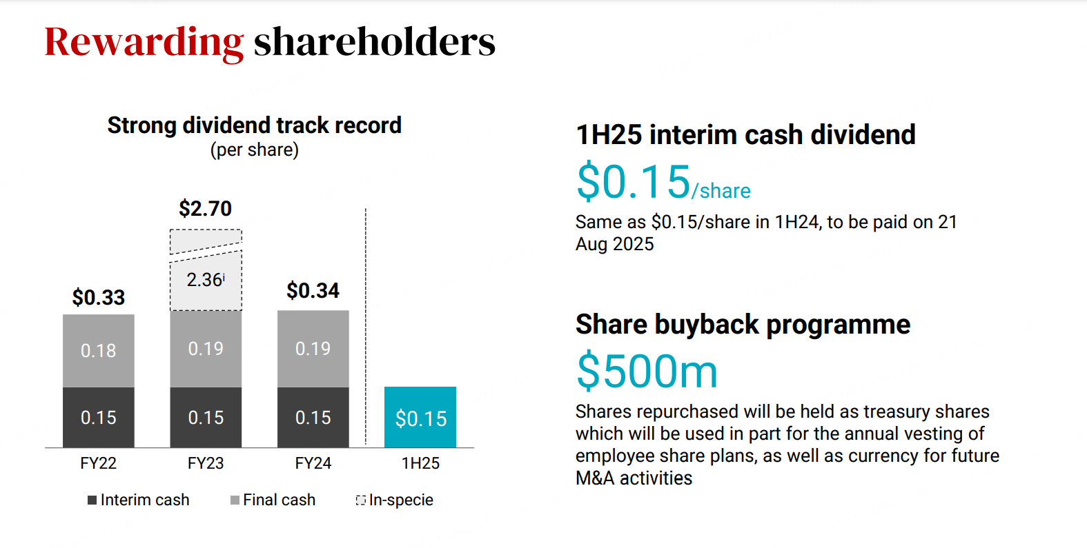 The interim dividend was maintained at 15 cents per share, and the group announced a new S$500 million share buyback plan, with shares to be held as treasury stock.